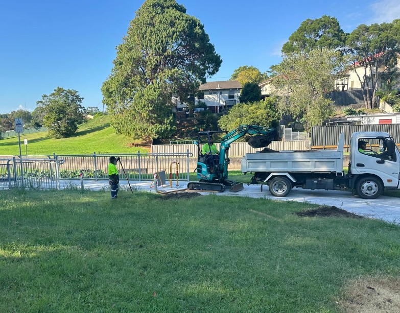 Preparing the site involved thorough hole preparation, taking into account the existing path infrastructure and the necessity to navigate around various utilities. To ensure optimal planting depth and profile, we utilised a mini excavator to carefully dig the tree pits. Following this, we positioned each tree, backfilled the holes, secured them with sturdy stakes, and applied a generous layer of mulch. This mulch plays a critical role in retaining moisture and suppressing competing weeds, allowing the trees to establish themselves effectively and setting the stage for a flourishing landscape that benefits the entire community.